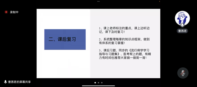 此次分享在线上进行,21级单科成绩优秀员工代表为22级的同学们就临床诊断学、毒理学基础、社会医学、卫生化学、医学心理学等学科的课堂重点和课后复习进行了细致的剖析与阐释,分享了预习重点和做笔记的技巧,激发了同学们对知识的探索,促使同学们构建自己的知识网络。同时希望同学们能够将所学的方法运用到日常学习中,积极复习,精心备考。