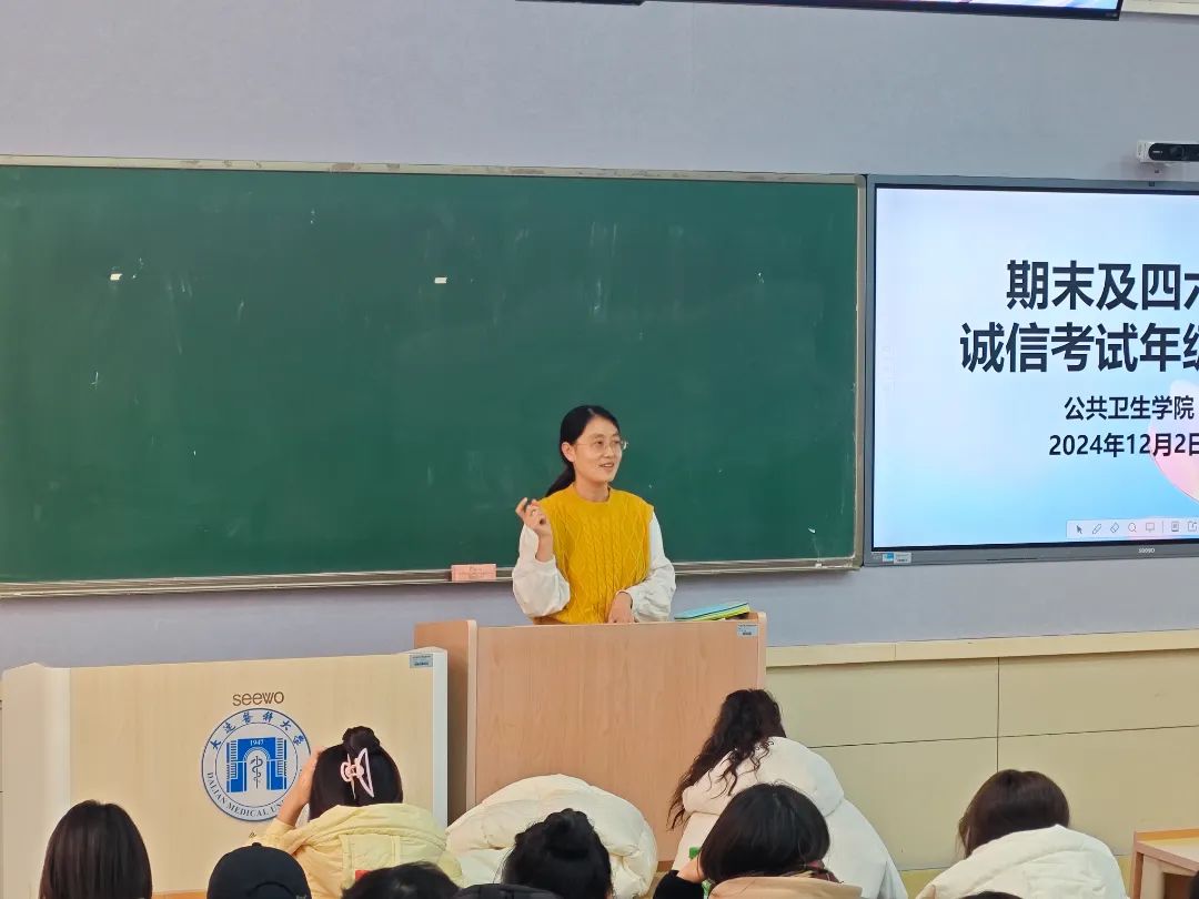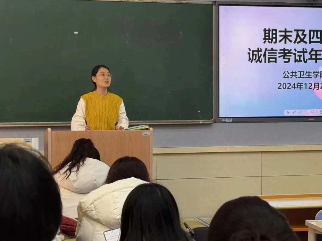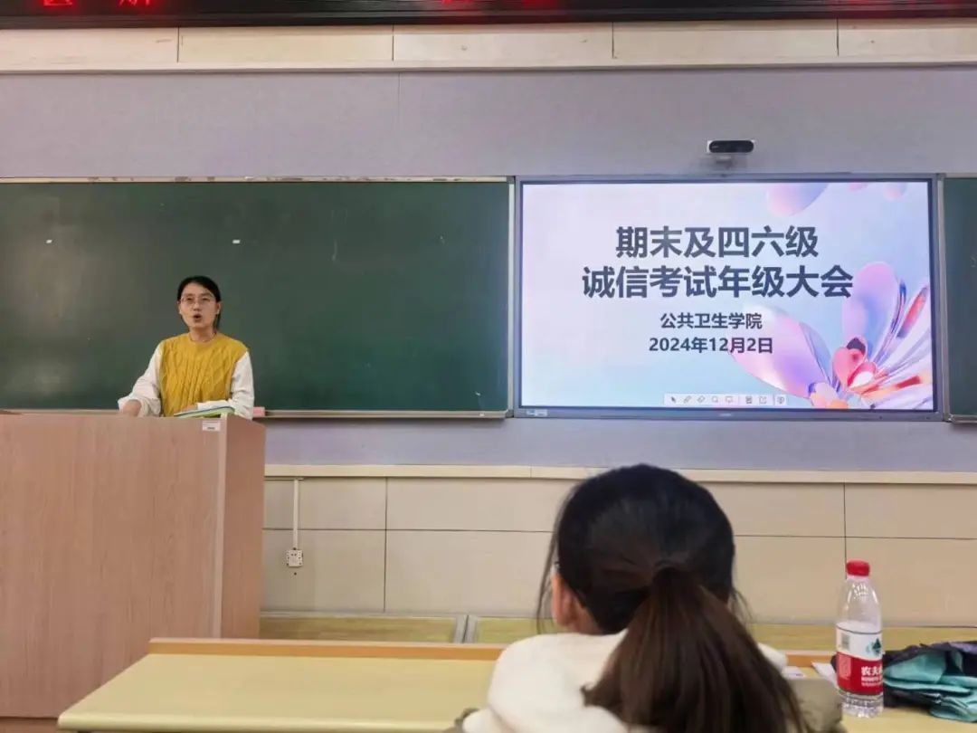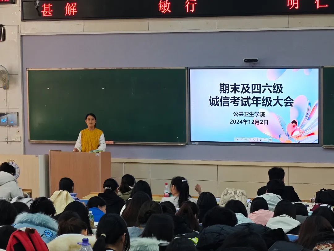 大会由王启云老师主讲。她从四个方面对诚信应考进行深入而细致地讲解。首先,王老师由《诚信考试承诺书》签署活动切入,对期末考试安排进行了全面介绍,特别提醒同学们密切关注考试时间,合理规划复习计划,以确保备考工作的有序进行。其次,针对期末及四六级考试,王老师强调了考试作弊的严重后果,告诫同学们要严格遵守考试纪律,秉持诚信应考原则,共同维护考试的公平与公正。接着,王老师着重强调了四六级考试的重要性,鼓励同学们以积极的心态、严谨的态度认真备考,全力以赴迎接挑战。同时提醒同学们在考试当天务必携带齐全考试所需物品,严禁携带手机等任何电子设备进入考场,严格遵守考场纪律,确保考试的顺利进行。同时,王老师针对重修补考问题进行了强调,并再次重申挂科将带来的的严重后果,把学校的最新留降级制度给同学们又介绍了一遍,她希望同学们端正态度,认真备考。最后,王启云老师祝愿全体同学考试顺利,取得理想成绩。在同学们热烈的掌声中,本次诚信考试年级大会圆满结束。