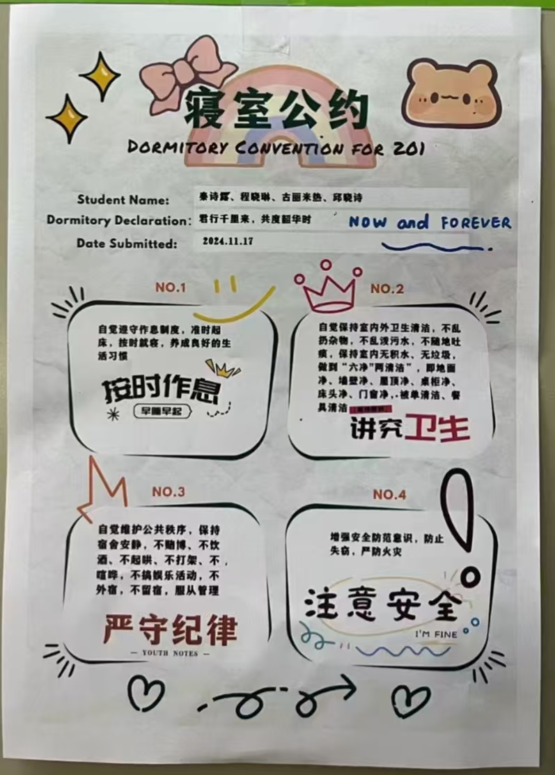 此次活动由生活权益部主办。活动旨在通过寝室商讨设计的形式,激发同学们的创新思维,增进室友间的相互了解与合作。活动要求寝室成员共同设计A4纸张大小的寝室公约,内容需涵盖作息时间、卫生保持、公共设施使用等多个方面。活动过程中,为确保公约内容明确、易于寝室成员遵守,参赛寝室纷纷发挥创意,首先将公约结果整理成书面形式,并将公约贴于宿舍门上,拍照上传至指定邮箱。随后,生活权益部成员根据寝室设计的创意性、实用性以及公约的合理性、可行性等方面进行综合评分,最终评选出了一批优秀寝室公约作品。在大家积极热情的参与之下,此次活动圆满结束。