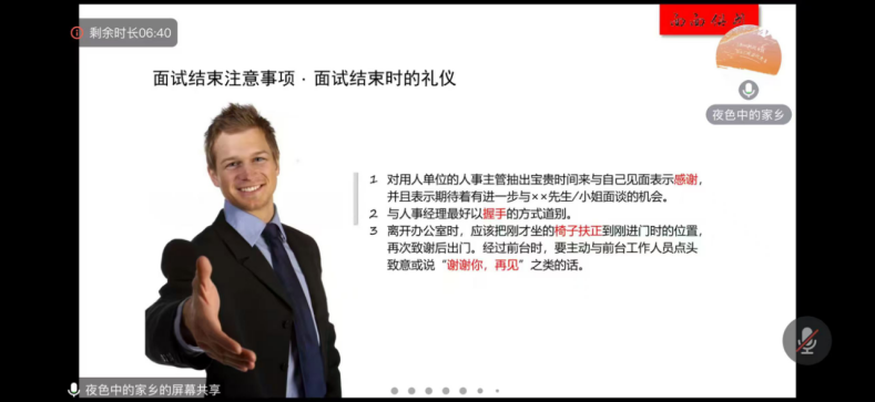 为提升员工求职竞争力,帮助员工更好地掌握面试技巧,球友会于10月23日在腾讯会议线上举办了一场面试技巧指导讲座。讲座特邀来自锦州何氏眼科医院的人力资源部主任牟海力老师担任主讲。牟老师长期从事人力资源管理,经验丰富,对当前的就业形势和面试技巧有着深入的研究和独到的见解。两位辅导员老师老师及全体毕业年级员工参加了此次会议。