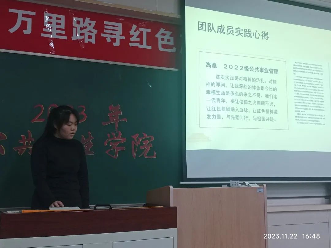 红色研学实践团队队员刘雨珊同学对“传中国特色,承党的初心”队组的实践结果进行了展示汇报。团队前期通过对高校员工的问卷调查和数据分析,调查了人群对党史知识和文化常识的了解现状以确定实践目的,随后走进陕西省,河南省,辽宁省,贵州省,河北省五省纪念馆和博物馆,实地考察感受。交流总结了党的伟大革命精神,学习体悟了中华优秀历史文化,深切感受到了今天和平安宁的来之不易,更加坚定自己肩上的责任和使命,也深刻领悟到了青年是新时代的奋斗主力军,不仅要赓续传统文化,也要不忘初心。实践成员许下了作为新时代接班人“不忘初心,牢记抗战英雄丰功伟绩”的铮铮誓言。