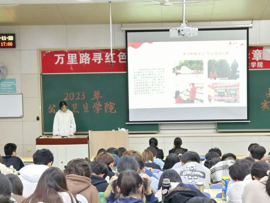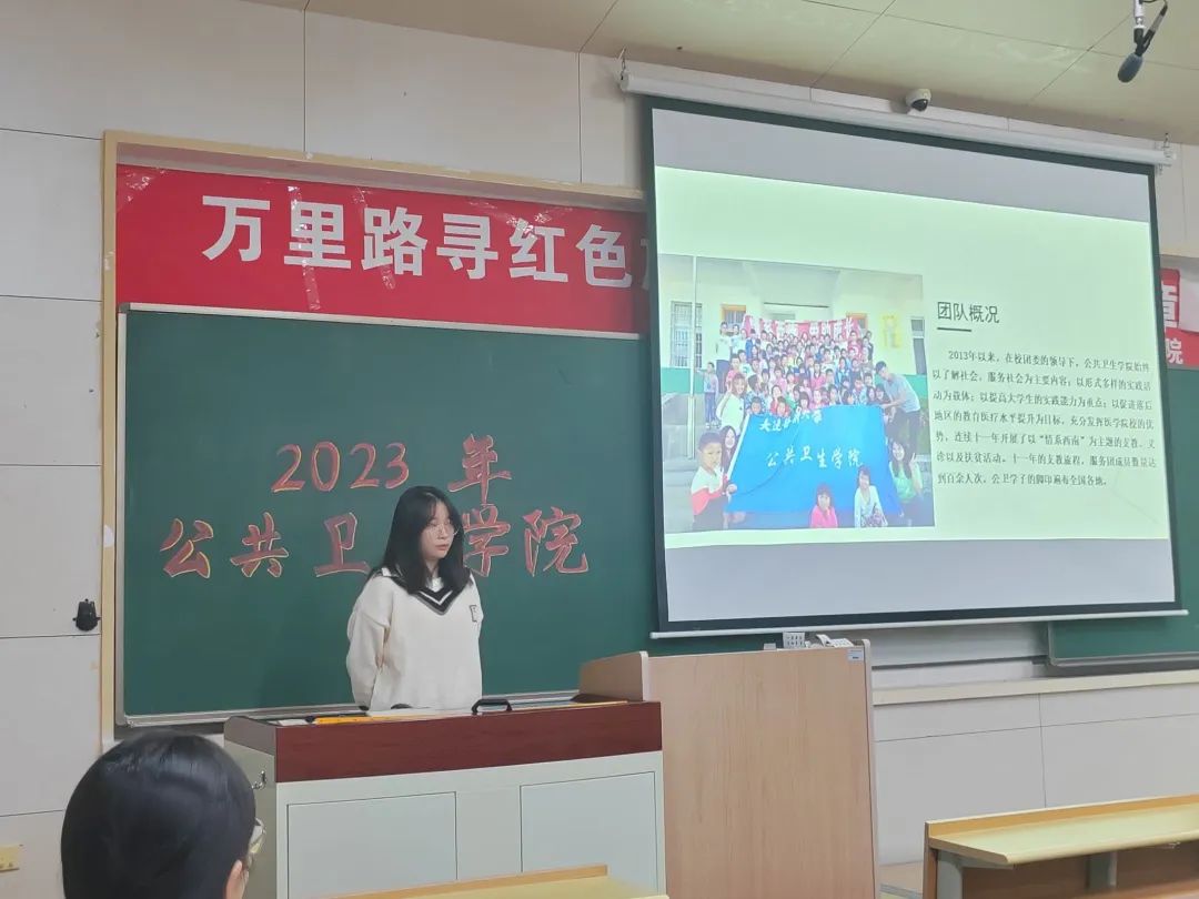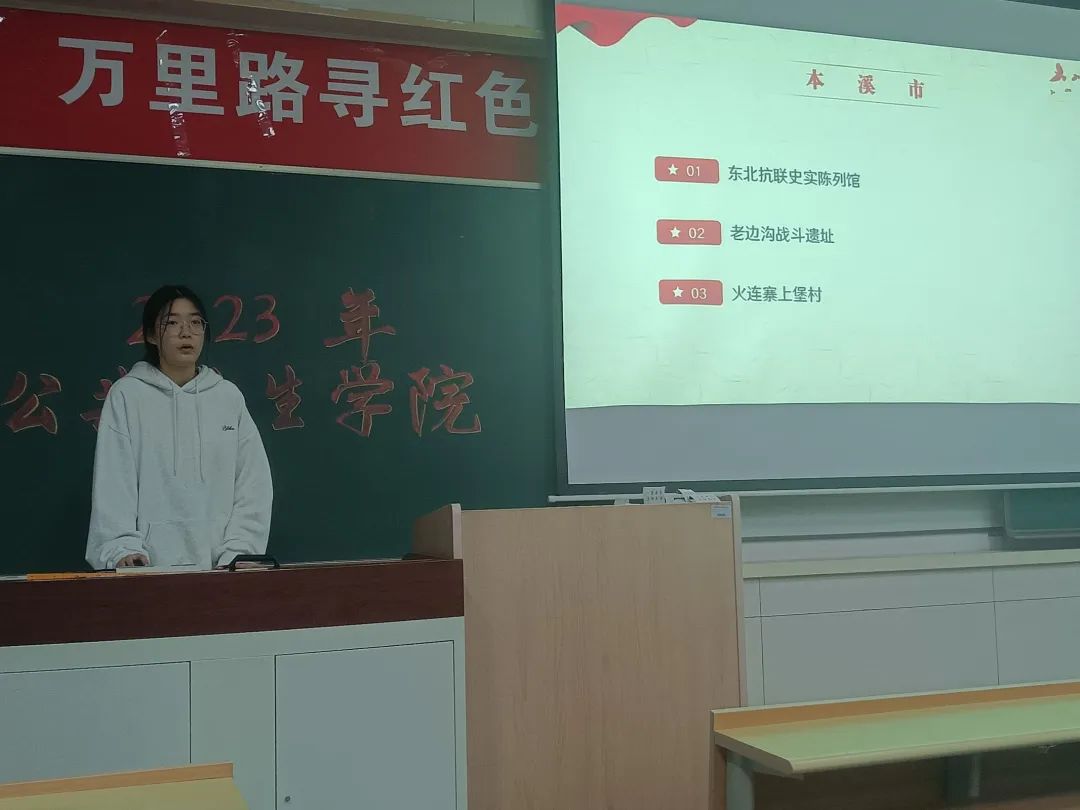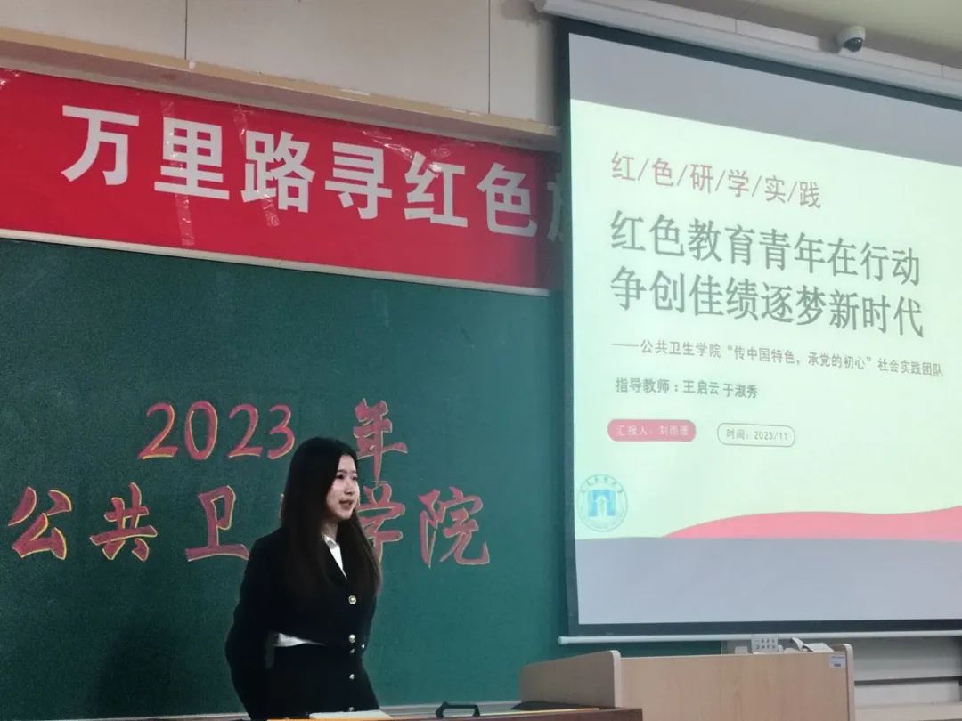 第四个分享队组为东北抗联实践团,队长裴璐同学向大家详细介绍了以“传承抗联精神,重走抗联路”为主题的实践成果。团队成员前往黑吉辽三省东北抗联教育基地进行参观学习并进行线上线下相结合的问卷调查,发挥学科特色与专业特长,追寻革命历史遗迹、开展抗联知识宣讲、举办红色义诊活动,团队把抗联精神与医者情怀相结合,全程被本溪电视台报道并形成调研报告巩固实践成果,让历史精神跨越时空,在实践中历久弥新,以赤诚之心践行医道。新时代的青年不忘初心使命,重新行走在白云黑水之间,缅怀革命先烈,为建设美好中国添砖加瓦。