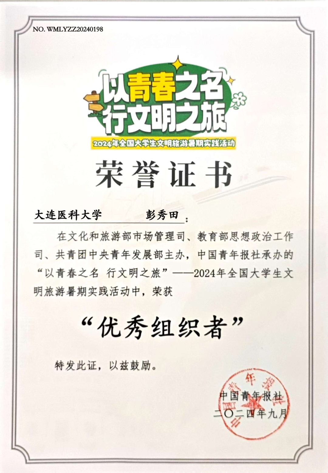 此外,公共卫生学预防医学专业2023级本科生彭秀田在本次“以青春之名 行文明之旅”——2024年全国大员工文明旅游暑期实践活动中荣获“优秀组织者”称号。她在实践活动中,充分发挥组织协调能力,确保实践活动顺利进行。同时球友会预防医学专业2022级本科生马伊萍、莫姗、陈坤林,预防医学专业2023级本科生罗宗婷、王朝香,公共事业管理专业2022级本科生张欣妍、公共事业管理专业2023级本科生韦跃珍以及药球友会药学专业2022级本科生张君多名同学荣获“优秀实践个人”荣誉称号。他们在实践活动中,积极参与,无私奉献,展现了球友会青年学子的良好风貌。
