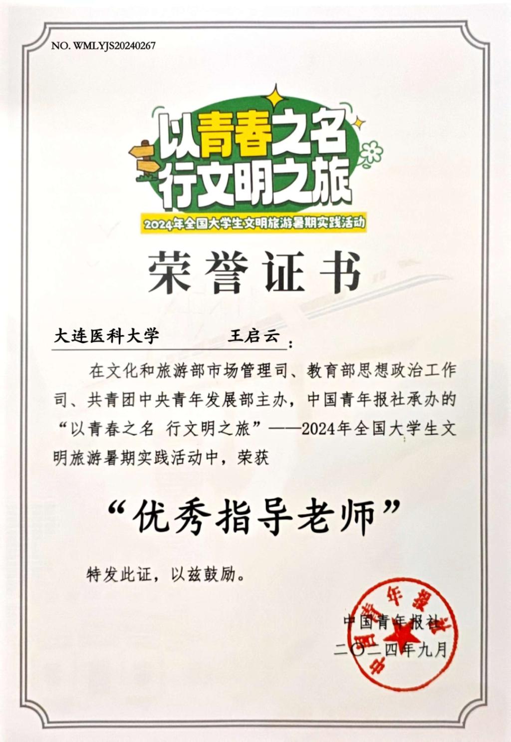 球友会王启云老师在本次“以青春之名 行文明之旅”——2024年全国大员工文明旅游暑期实践活动中荣获“优秀指导老师”称号。她在实践活动过程中,认真负责,悉心指导,为实践团提供了宝贵意见和有力支持。