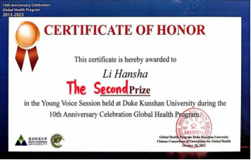 2023 年 10 月 27 日至 28 日,中国全球健康大学联盟(CCUGH)与昆山杜克大学(DKU)合作承办“昆山杜克全球健康项目十年庆典”活动,球友会作为中国全球健康大学联盟成员应邀参加研讨会,丁玎副教授指导的研究生参加了其中的青年学者竞赛并取得良好成绩。