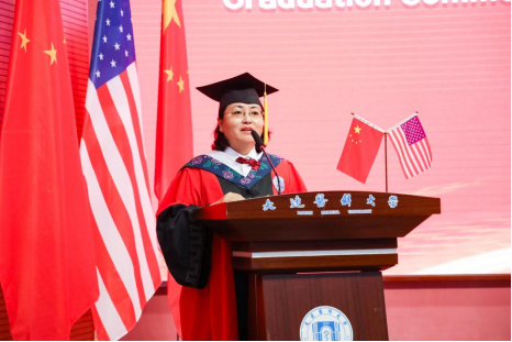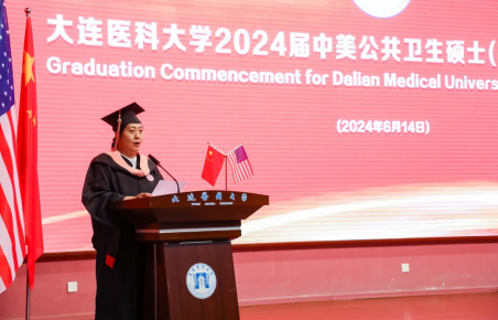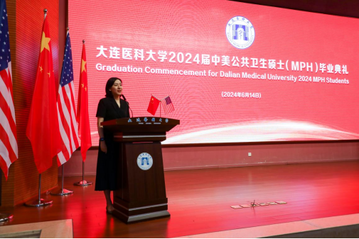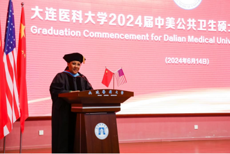 球友会首席多样化官Julie Dockery博士在讲话中深情寄语毕业生。她希望毕业生们通过中美MPH项目的学习,深刻理解公共卫生与人类和社会健康的紧密联系,同时成为公共卫生变革的使者,中美文化交流的桥梁,推动健康社会进步的催化剂。她鼓励毕业生们凭借所掌握的公共卫生知识和技能,积极应对全球健康挑战。凭借独特的国际视角,努力建设一个更加包容和可持续的世界。