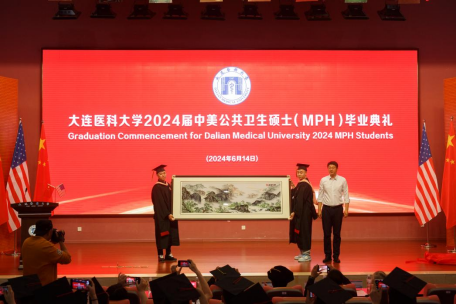 2024届毕业生、大连市友谊医院护理部主任李波代表全体毕业生发言。她表示,衷心感谢学校提供学习和逐梦的平台,国际化的授课模式和全英文沉浸式的教学,让员工们接收到了高质量的教育资源。感谢中美双方教师的辛勤付出,在中美合作MPH项目学习期间,同学们不仅学到了理论知识,而且提升了应用与实践的能力。今后,大家将利用所学成果在各自岗位上努力工作,以更高的使命感和责任感要求自己,为公共卫生和医疗卫生事业的发展贡献力量。之后,毕业生们将一幅“紫气祥云”的匾画赠送给母校,留作纪念,于泳书记代表学校接收纪念品。