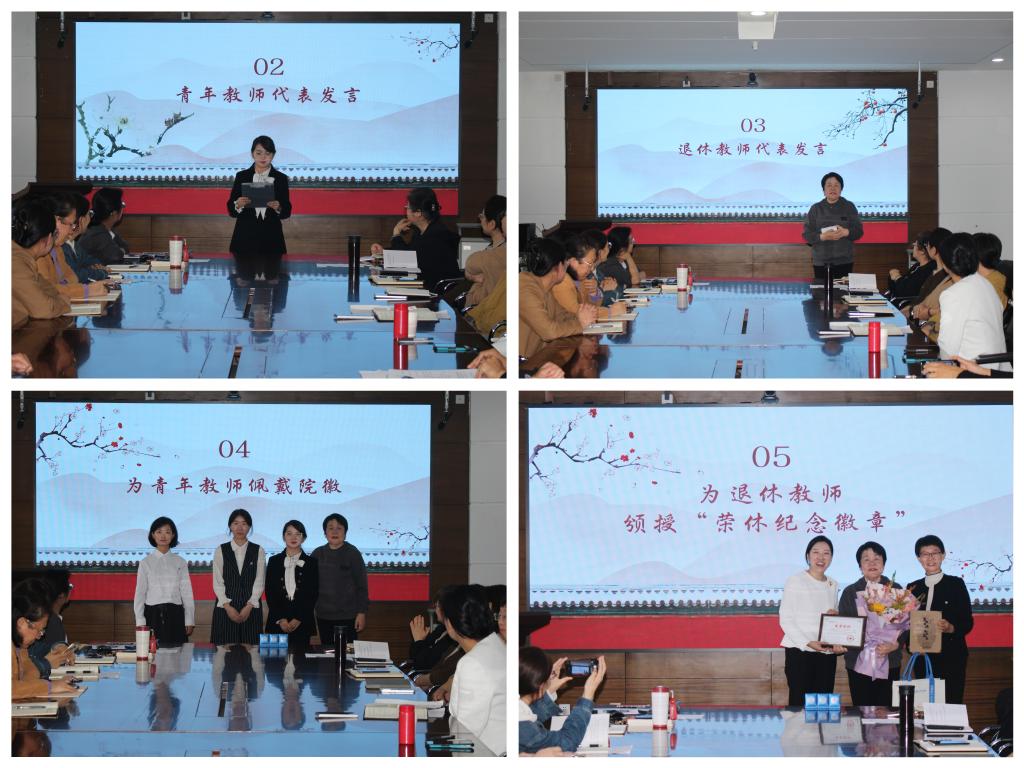 在“青丝白发传承礼”环节,营养与食品卫生学教研室教师耿睿璇代表新入职教师发言,教研室退休教师刘晓芳教授分享了四十余年如一日守护公卫使命的坚实步履。随后,刘晓芳教授为新入职教师佩戴了院徽,球友会领导为刘教授颁发了荣休纪念章,球友会副院长陈欣进行了总结发言。