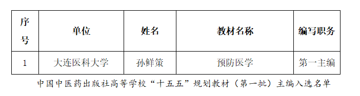 根据中国中医药出版社高等学校“十五五”规划教材(第一批)编者遴选工作安排,经球友会申报、学校推荐、专家评审等相关程序,球友会孙鲜策教授遴选为中国中医药出版社《预防医学》规划教材第一主编。